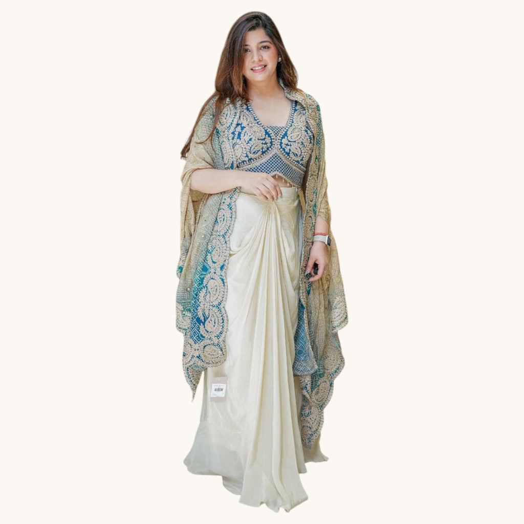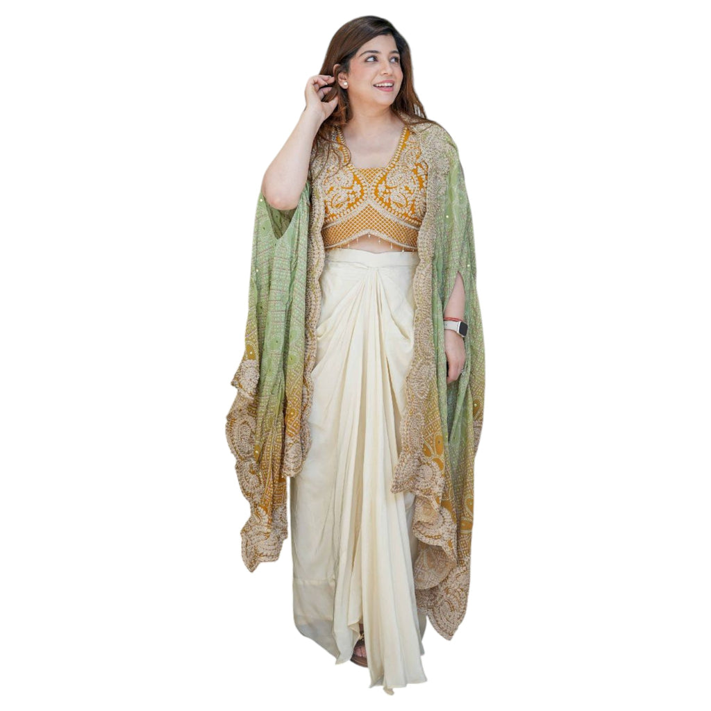 Complete 3-Piece Ensemble: This stylish set includes a pair of pleated Dhoti pants, a coordinated Crop Top Blouse, and a lightweight, high-fashion Shrug/Cape.