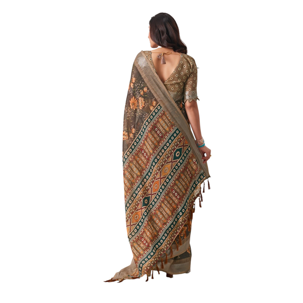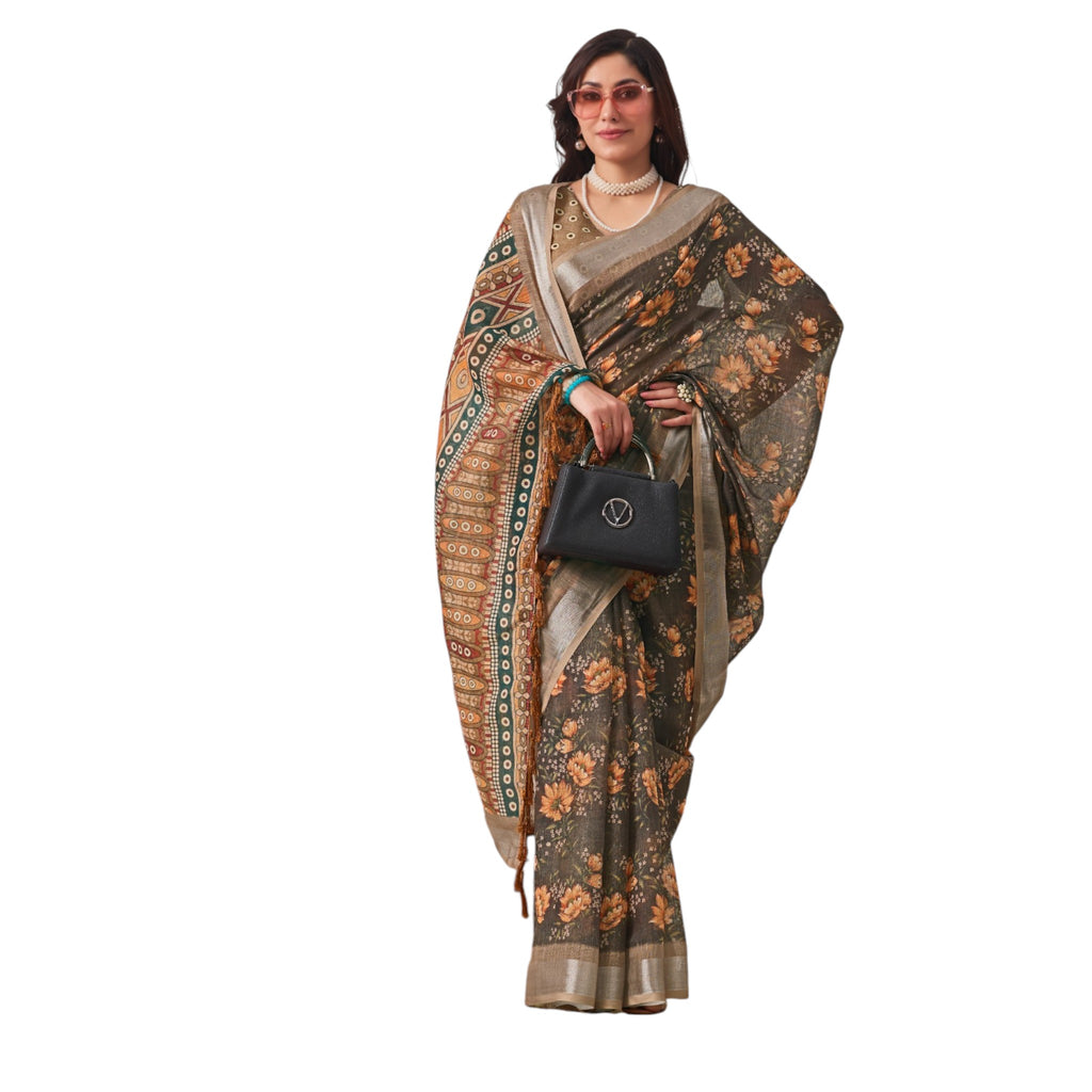 Linen Cotton Saree with Beautiful floral pattern Digital Printed Design (5.5 meters)